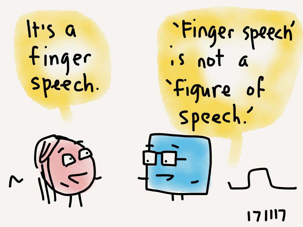 Finger Speech #comic Though I suppose sign language could involve fingers of speech. Raymond Nakamura, Ph.D.November 17, 2017Comment 0 Likes