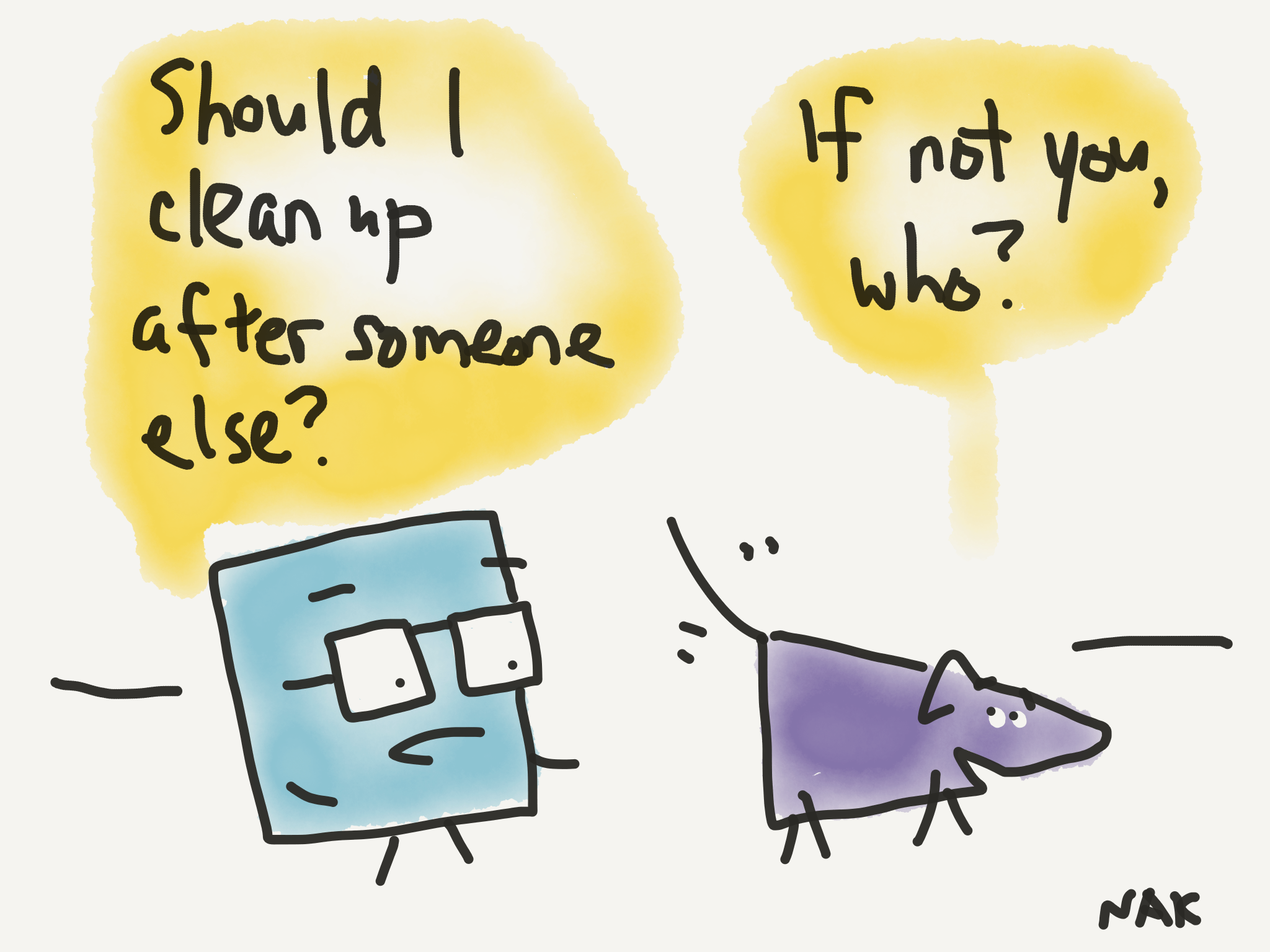Not to get gross, but walking my dog I do come across things that should not be there. Did those responsible not notice? I remember the issue repeated in Altman’s film on high fashion. And an artist who would make plates of food around it. I don’t want to deal with others crap. But then what?