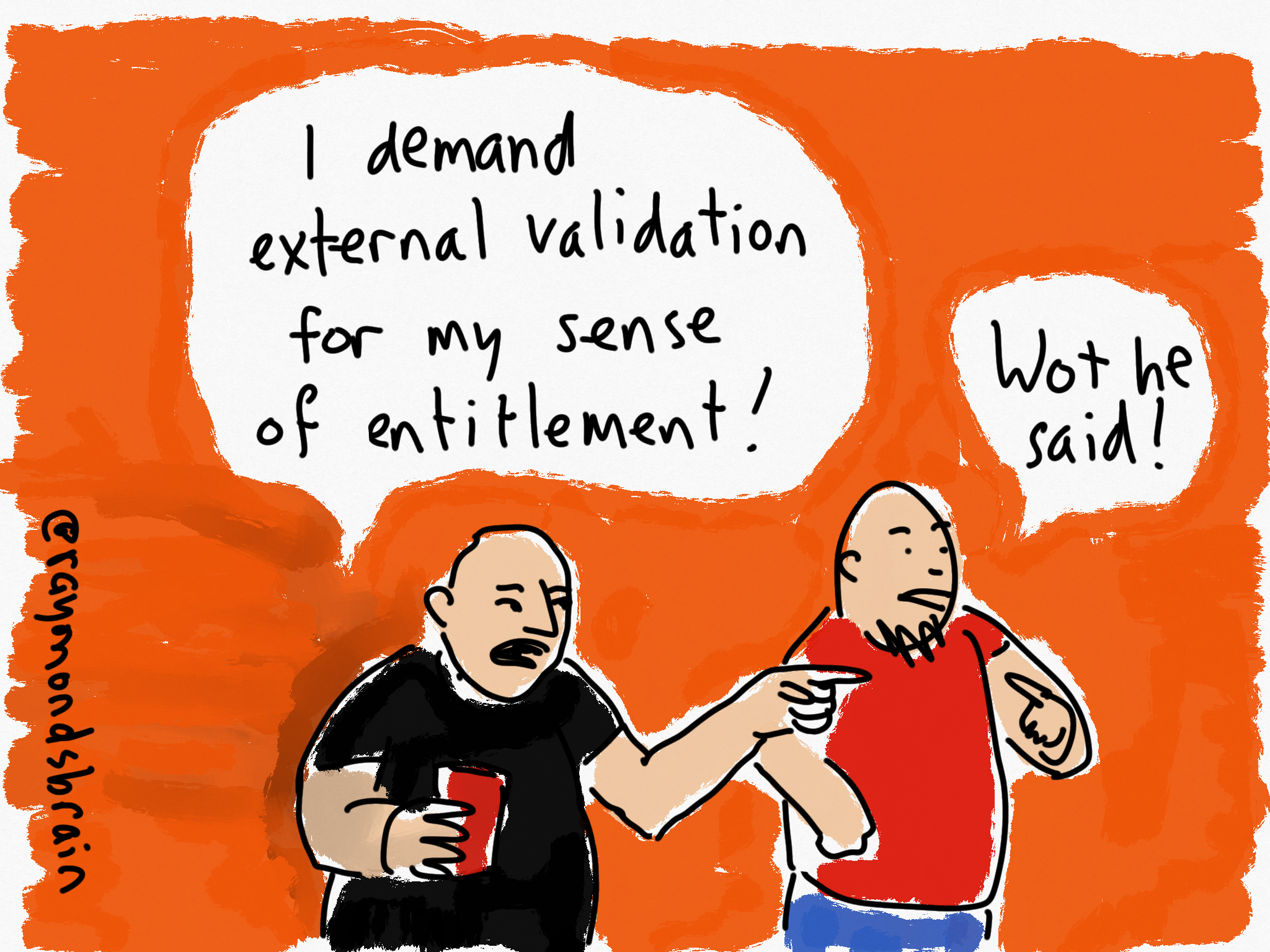 This exhibit of paintings by David Haughton at the Visual Space gallery consisted of portraits of criminals and disturbing collages of white supremacists, based on photos on the internet. Haughton is appalled by their behaviour and hoped that presenting their images could be a chance to role play our opposition to them. Haughton said he hoped they would be ashamed of their actions, but the images themselves seemed like fairly straightforward depictions, so conceivably the subjects might actually be pleased to see themselves so depicted. It seemed well intentioned but misguided. I don’t know if my cartoon is any better.