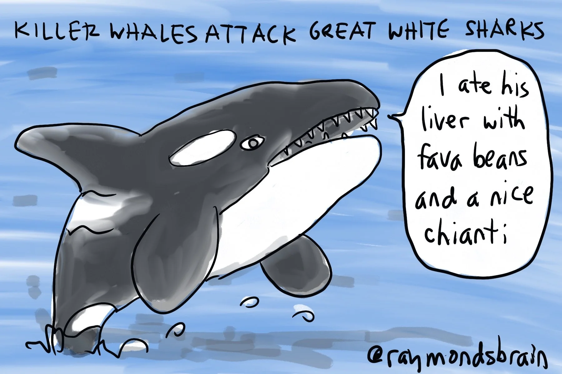 Predator becomes prey as killer whales hunt great white sharks in South Africa. It’s not cannibalism of course, so maybe I should not have used the Hannibal Lector quote from Silence of the Lambs, but they mentioned eating the liver, so it came to mind. Sharks do have big oily livers, which supposedly help them with buoyancy instead of an air bladder in bony fishes, at least from what I recall from dissecting a dogfish in university.