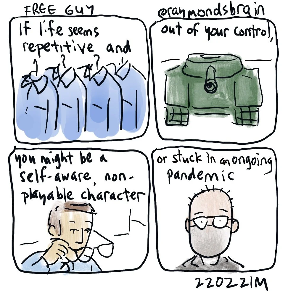 I enjoyed Ryan Reynolds in Free Guy. He has shirts that are all blue. One day he tries to order a different kind of coffee and a tank takes aim at him so he changes his might. He works at a bank that is held up many times a day because he lives in a video game. One day he gets the sunglasses usually worn by the players and he sees the world in a whole new way.