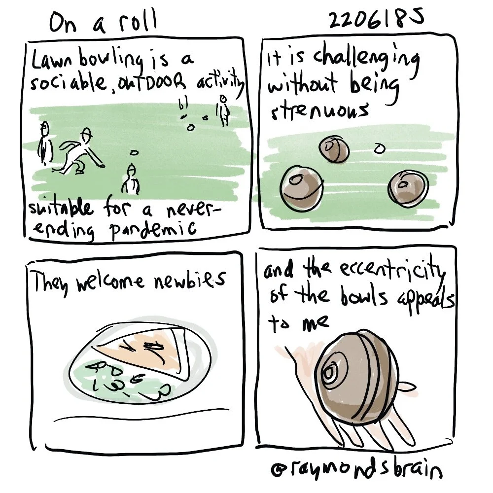 My spouse and I attended a recruitment evening at the local lawn bowling club, which included free pizza and some games. While the physical actions are akin to bowling, the rules and strategy is more like curling. Lawn bowling seems to be the ideal pastime for people entering the third phase of life during the long tail of the pandemic. It is a sociable activity that takes place outdoors and not too physically strenuous and yet a physical challenge. At the same time, everyone seemed quite friendly and accepted a range of abilities. I felt affinity to the skewed ball.